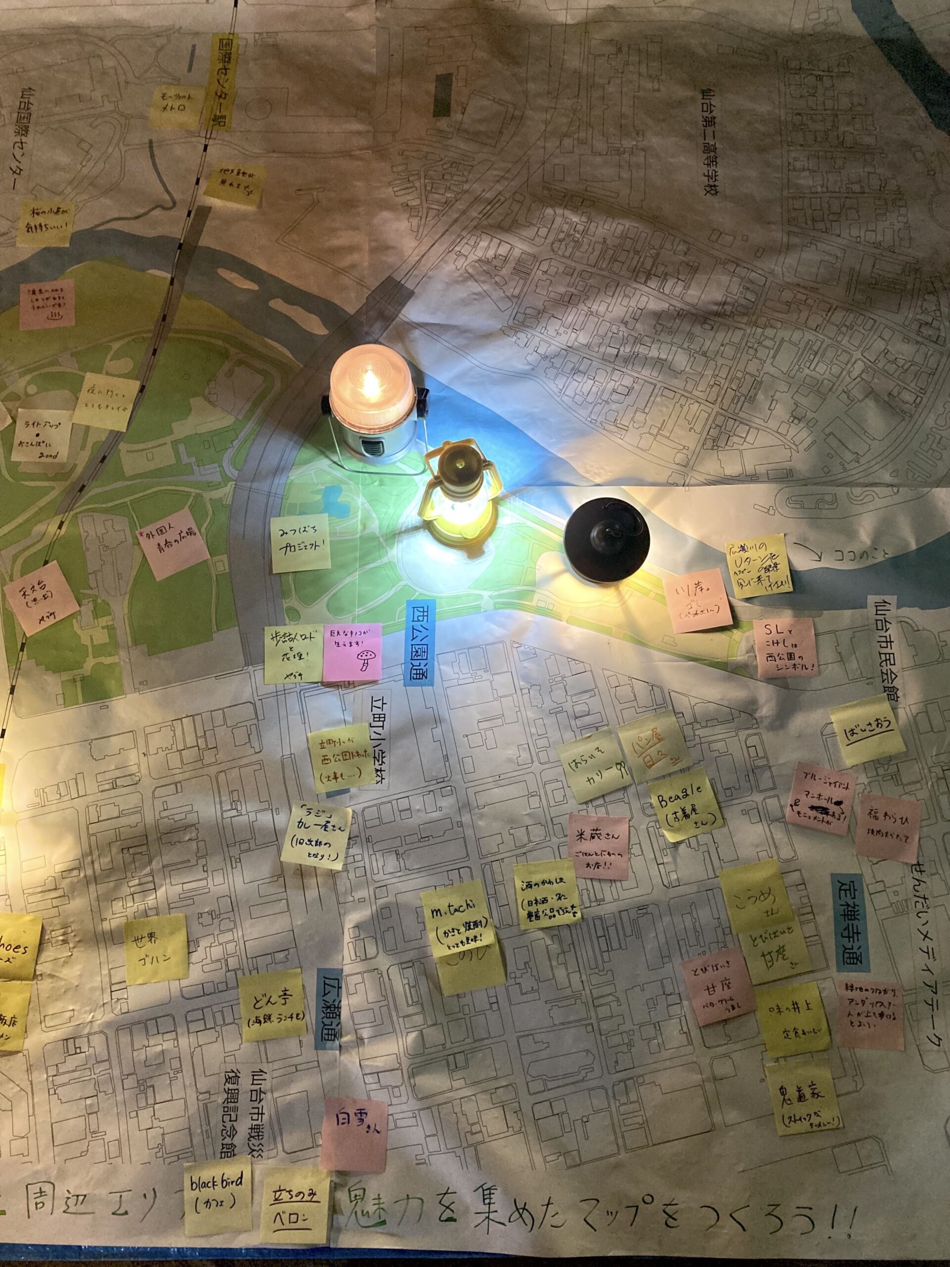 定禅寺通の中央緑道に大判の地図を広げて、西公園とその周辺の魅力的なモノ・コトについて、皆さんに書き込んでいただきました。